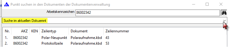 Neben der Suche in Dokumenten (Menü⇒Dokument⇒suche Punkte in Dokumente) kann die Suche in dem aktuellen Dokument beschränkt werden. Im Dialog zur Suche eines Punktes kann diese Suchoption ausgewählt werden. Zusätzlich steht diese Funktion auch im Kontextmenü des Dokumentes zur Verfügung: Klickt man in einem Dokument mit der rechten Maustaste auf ein Arbeitskennzeichen, kann man die Suche des Punktes im aktuellen Dokument im Kontextmenü auswählen.