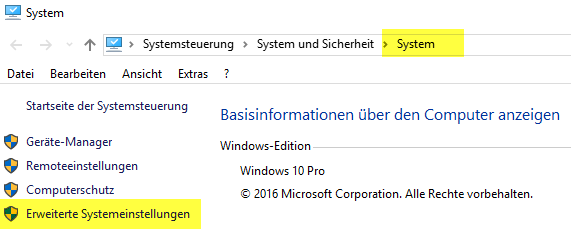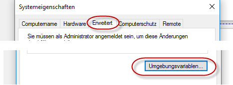 Die eingetragenen Umgebungsvariablen können in der Systemsteuerung angezeigt wer-den. Öffnen Sie hierzu den Dialog „Systemsteuerung → System → erweiterte System-einstellungen“.