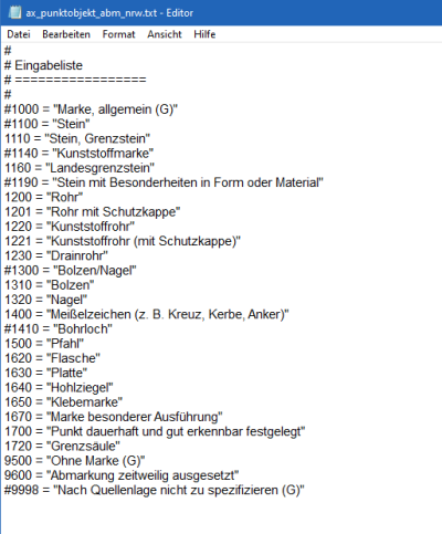 Sie können eine Auswahl deaktivieren (#) oder auch wieder aktivieren. Setzen Sie dazu vor der Zeile eine Raute (#), bzw. entfernen Sie diese. Sie können auch noch weitere Abmarkungen hinzufügen. (siehe Datei ax_punktobjekt_abm.txt)