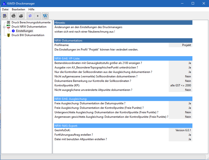 | Amt (nachfolgende Einstellungen sind nicht editierbar. Projekt (nachfolgende Einstellungen können idividuell eingestellt werden. | K_DRUCKMANAGER_NRW_DOKU_AMT_PROFIL_AKTIV = | J N |