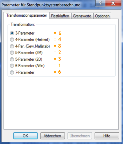 Neben den Transformationsparametern kann nun auch die Methode der Restklaffenverteilung gewählt werden. Standard ist: 3-Parameter-Transformation ohne Restklaffenverteilung. Das Ausgabeformat wurde um die Hinweise zur verwendeten Methode der Restklaffenverteilung erweitert.